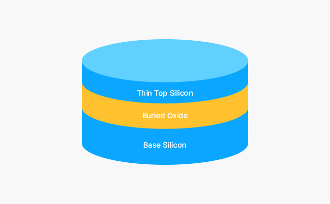 SOI 衬底 (Silicon-on-Insulator, 绝缘体上硅) 具有三层结构:顶层的单晶硅薄膜 (器件层)、中间的二氧化硅绝缘层 (BOX 层,Buried Oxide Layer) 和底层的硅衬底。